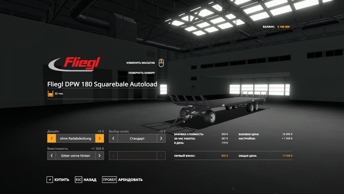 Прицеп Fliegl DPW 180 оснащен функцией автозагрузки прямоугольных тюков. На платформе прицепа можно размещать до 32 тюков. Устройство должно находиться в рабочем положении, чтобы игрок мог воспользоваться автозагрузкой. Мод позволяет выбирать местоположение разгрузки.